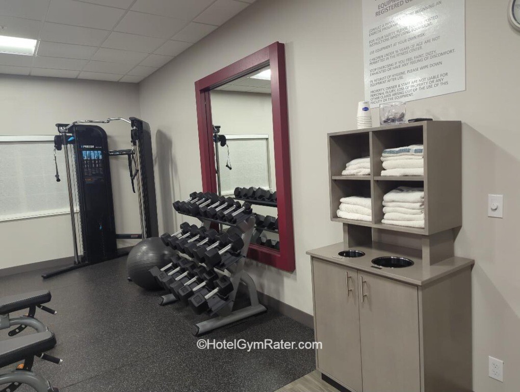 Time of visit: March 2026 Equipment Dumbbells went up to 50 lbs/22 kgs and there’re two adjustable benches as well. There’s also a dual cable machine in the corner of the room. As for cardio equipment, there’re three treadmills, a cross-trainer and a Peloton bike. Accessories covered exercise ...