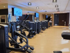 In terms of cardio equipment, there’re three cross-trainers, a stair-master, two stationary bikes and five treadmills.