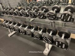 There’re kettlebells and dumbbells (up to 50 lbs/22 kgs) as well as three adjustable benches.