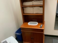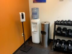 Although there’s a water cooler, there’s limited water in the cooler and no cups available. The hotel offers disinfectant wipes too, but the dispenser was empty.