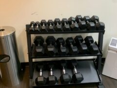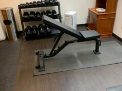 The hotel gym has dumbbells – from 5 to 50 lbs/2 to 22 kgs – and there’s an adjustable bench as well.