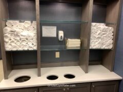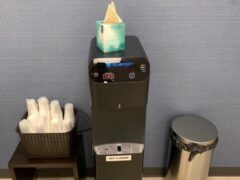 I liked that there’s a sign on the door as well as on all equipment to wipe down before and after use to help prevent spread of germs. Cups are individually wrapped at the cooler to prevent spread of germs.
