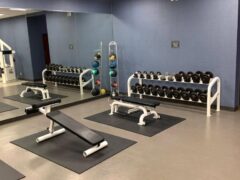 Dumbbells range from 5 to 50 lbs/2 to 22 kgs and there’s pair of adjustable benches including the decline option.