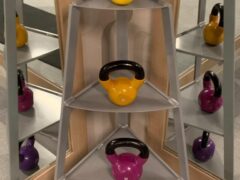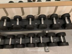 Dumbbells go up to 50 lbs/22 kgs and there’s an adjustable bench as well.
