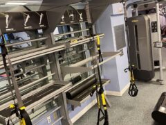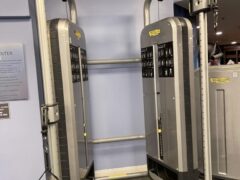 There’s a chest press machine, a shoulder press machine and a seated row machine. There’s also a cable machine, a TRX setup and assorted kettlebells.
