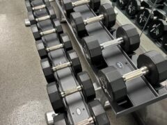 They have kettlebells and dumbbells go up to 50 lbs/22 kgs and there’s an adjustable bench as well.