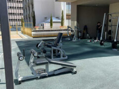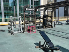 There’s a barbell bench press setup, a leg extension machine and a Smith machine.