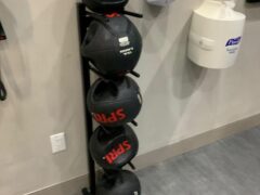 Accessories include medicine balls (from 6 to 20lbs/3 to 9 kgs), two exercise balls, a Bosu ball, a foam roller, and exercise mats.