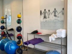There’s an exercise ball, a Bosu ball and a handful of medicine balls as well.
