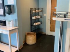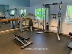 Dumbbells go up to 50 lbs/22kgs, there’s a cable machine with the usual handles, a chest press machine and a combined lat pull-down and seated row machine.