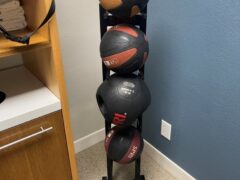 Accessories include an exercise ball, foam rollers, an exercise mat and medicine balls.