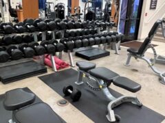 Dumbbells range from 5 to 100 lbs/2 to 45 kgs and there’re around four adjustable benches include a decline option.