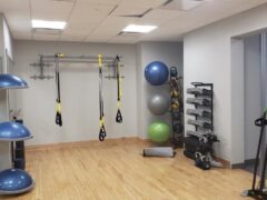 Accessories include a Captain’s chair, weight sticks, TRX equipment, Bosu balls, foam rollers, exercise balls, medicine balls, yoga mats and a fair selection of kettlebells (4 to 16 kgs).
