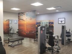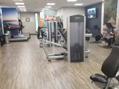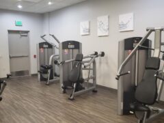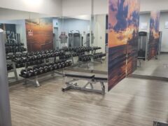 In terms of pin-operated machines, there’re leg curls/extensions, leg presses, shoulder presses, chest presses, lat pull-downs and an ab machine.