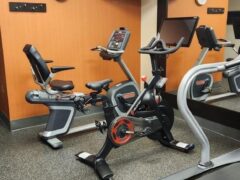 As for cardio equipment, there’s a stationary bike, a Peloton bike, two treadmills and a cross-trainer.