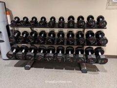 Dumbbells range from 5 to 75 lbs/2 to 34 kgs and there’s an adjustable bench as well.