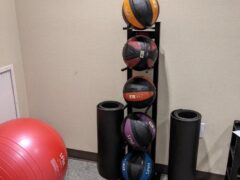 There’s an exercise ball, a handful of medicine balls and a few exercise mats too.