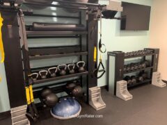 Accessories include a Bosu ball, resistance bands, slam balls, exercise balls, a box jump and foam rollers. There’s also a TRX system.