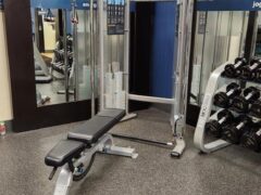 There’s a cable machine and dumbbells (up to 50 lbs/22 kgs) plus an adjustable bench.