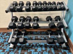 They have dumbbells ranging from 5 to 40lbs/2 to 18 kgs. There’s also an adjustable bench.