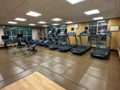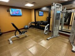 This hotel gym is located in a Hilton Garden Inn and a Homewood Suites facility which are connected by a lower-level floor that offers an indoor pool, a hot tub, and a large hotel gym!