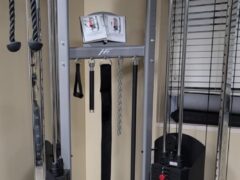 Dumbbells range from 1 to 50 lbs/2 to 22 kgs and there’s an adjustable bench as well as a cable machine with a decent range of different handles.
