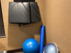 Accessories include exercise mats, a Bosu ball and an exercise ball and disposable headphones.