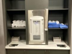 There’s a nice and clean water dispenser with clean towels for your use.