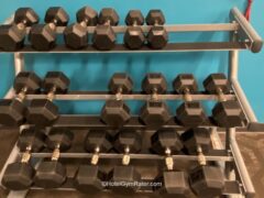 There’re dumbbells ranging from 10 to 50 lbs/4 to 22 kgs and two adjustable benches to work on.