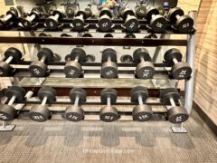 Dumbbells go up to 50 lbs/22 kgs and there’s a pair of adjustable benches to work with.
