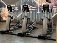 The cardio section includes three cross-trainers, a rowing machine, two spinning bikes and three treadmills.