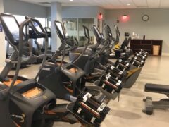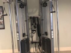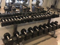 They have kettlebells and dumbbells as well as adjustable benches. There’s even a multi-gym in the corner giving you the option of doing leg-presses, lat pull-downs or chest presses. There’s also a cable machine with a wide variety of handles.