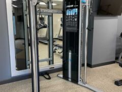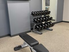 There’s a cable machine with a nice range of handles, a solid selection of dumbbells (1 to 50 lbs/2 to 22kg) and a pair of adjustable benches.
