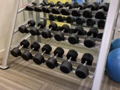 Dumbbells go up to 50 lbs/22 kgs and there’s an adjustable bench well.