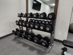 They have kettlebells and dumbbells (up to 50 lbs/22 kgs) and there’s an adjustable bench as well.