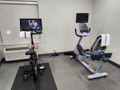 As for cardio equipment, there’s a stationary bike, a Peloton bike, a cross-trainer and two treadmills.