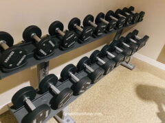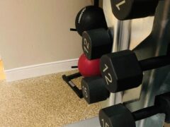 There’re kettlebells and dumbbells (up to 50 lbs/22 kgs) as well as an adjustable bench.