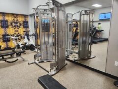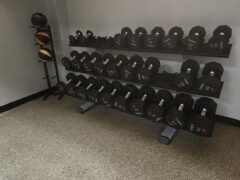 There’s a cable machine with a fair selection of handles. They also have dumbbells – up to 75 lbs/34 kgs – and three adjustable benches including a decline option.