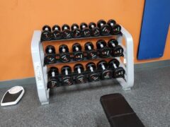 Dumbbells go up to 50 lbs/22 kgs and there’s an adjustable bench as well.
