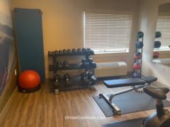 Dumbbells went over 40 lbs/18 kgs for sure and there’s a bench to work with as well.