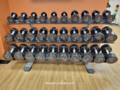 Dumbbells go up to 75 lbs/34 kgs and there’s an adjustable bench as well.