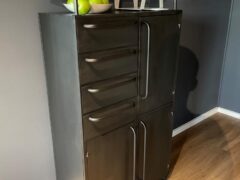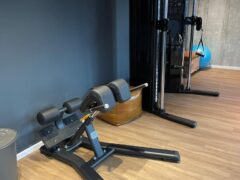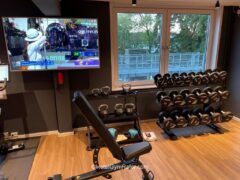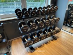 Dumbbells go up to 50 lbs/22 kgs, kettlebells to 53 lbs/24 kgs, and there’s an adjustable bench as well.