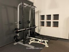 There’s also a barbell set up allowing you to do anything from squats and bench presses to deadlifts, etc.