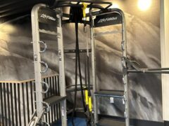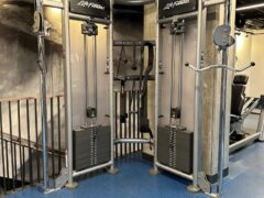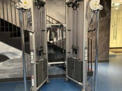 There’re two dual cable machines, a Smith machine and a seated leg press machine.