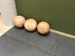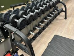 Dumbbells go up to 55 lbs/25kgs, kettlebells up to 33 lbs/15 kgs and there’s an adjustable bench as well.