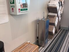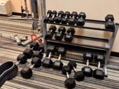 Dumbbells were all over the place but go up to 50 lbs/22 kgs and there’s an adjustable bench as well.