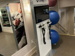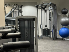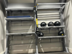 Accessories include exercise mats, exercise balls, a Bosu ball, medicine balls and slam balls. There’s also a TRX setup.