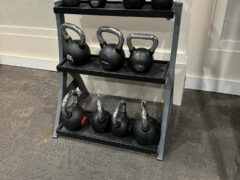 Dumbbells went up to 60 lbs/27 kgs, kettlebells up to 52 lbs/23 kgs and there’re different benches to work with.