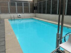There’re courtesy headphones, a stretching area and a small outdoor lap pool.