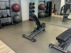 Dumbbells go up to 50 lbs/22 kgs, kettlebells go up to 30 lbs/14 kgs and there’re two adjustable benches as well.